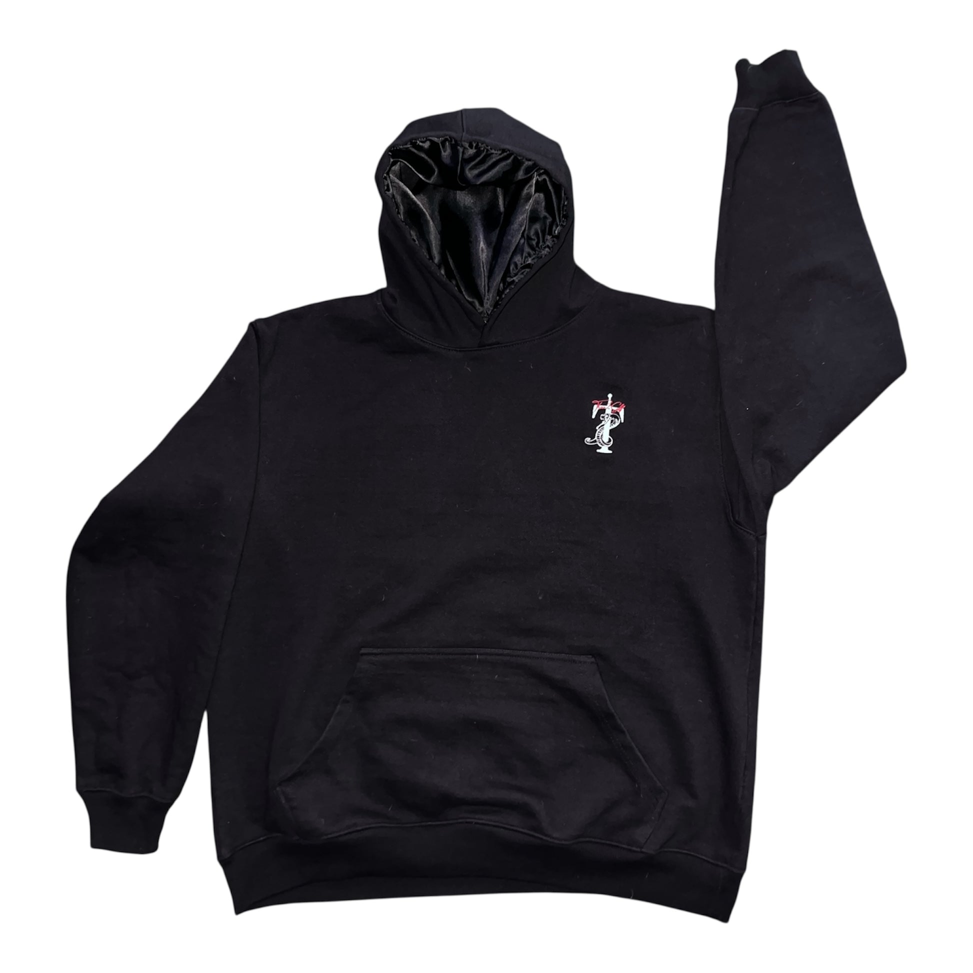 Embrace luxury with our Black Hoodie, crafted with exquisite black silk lining for ultimate comfort. The back showcases intricate embroidery with striking red silk accents, adding a touch of elegance to a classic silhouette. True to size, this hoodie offers a perfect blend of style and fit.